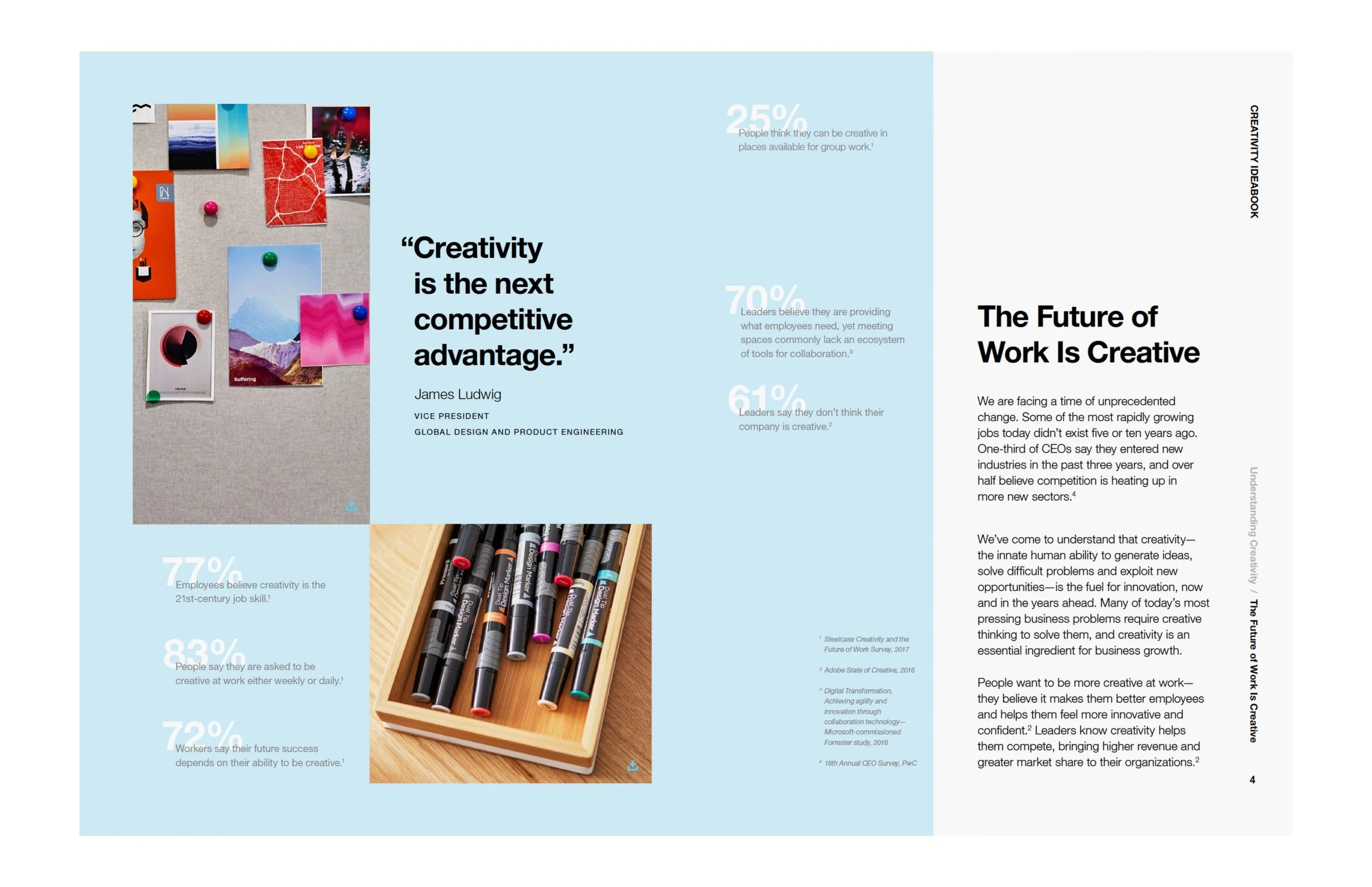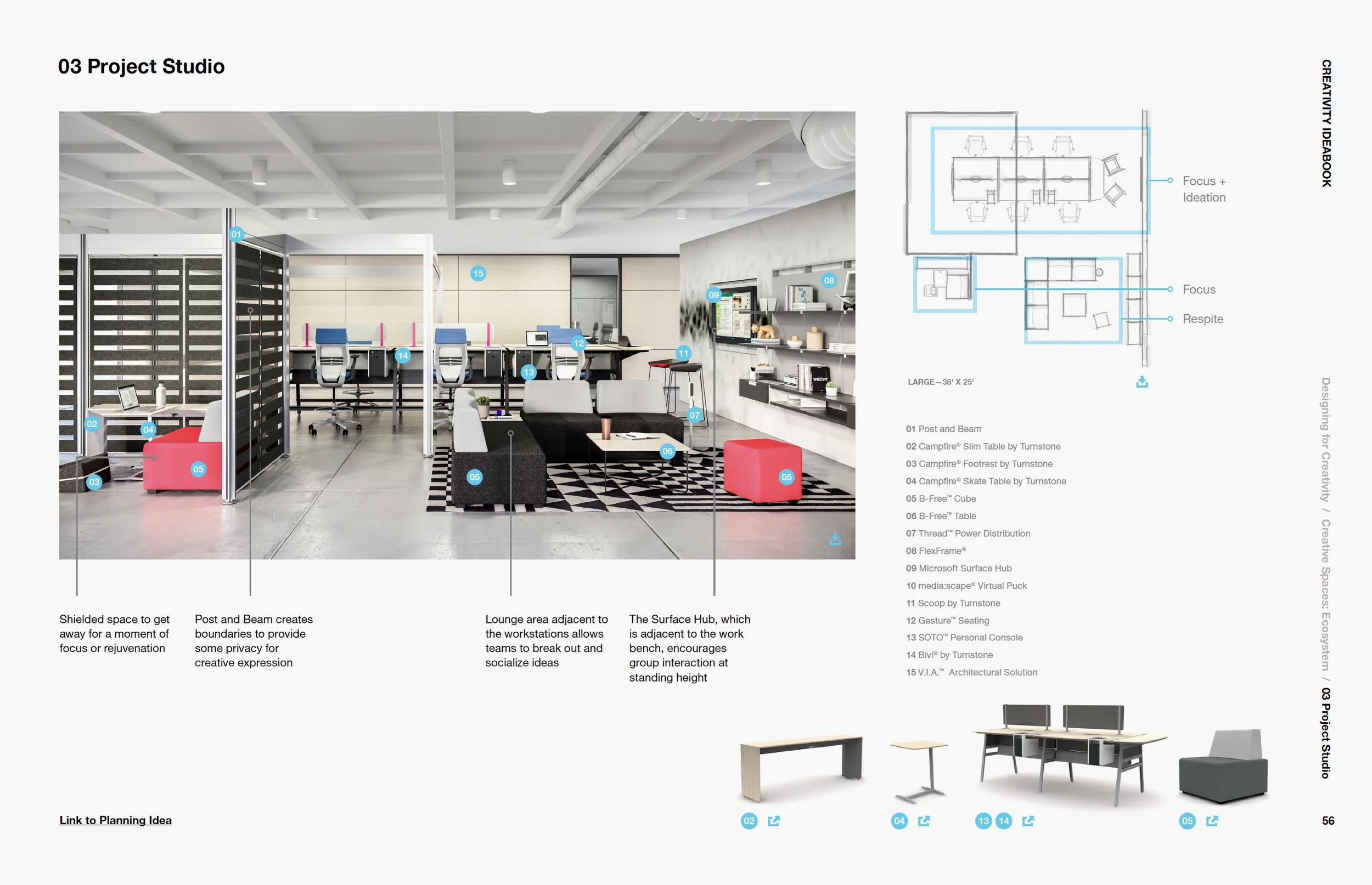 The Creative Spaces Ideabook is an interactive digital look book, meant to support the Steelcase sales team and spark the consumer to think beyond the standard office and encourage creativity through their environment.